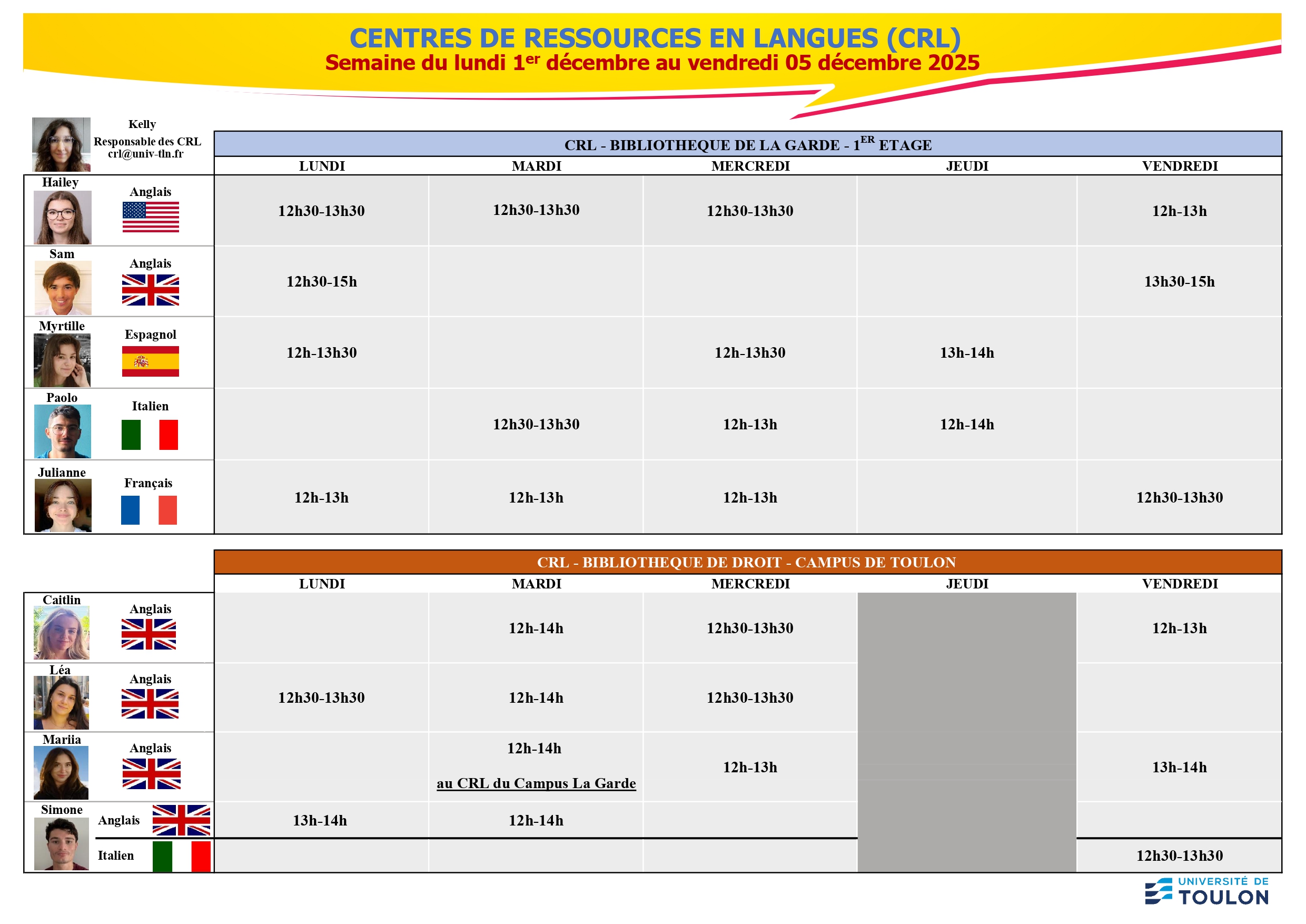 Le planning est mis à jour chaque semaine sur cette page ainsi que sur les portes d’entrée des CRL.
