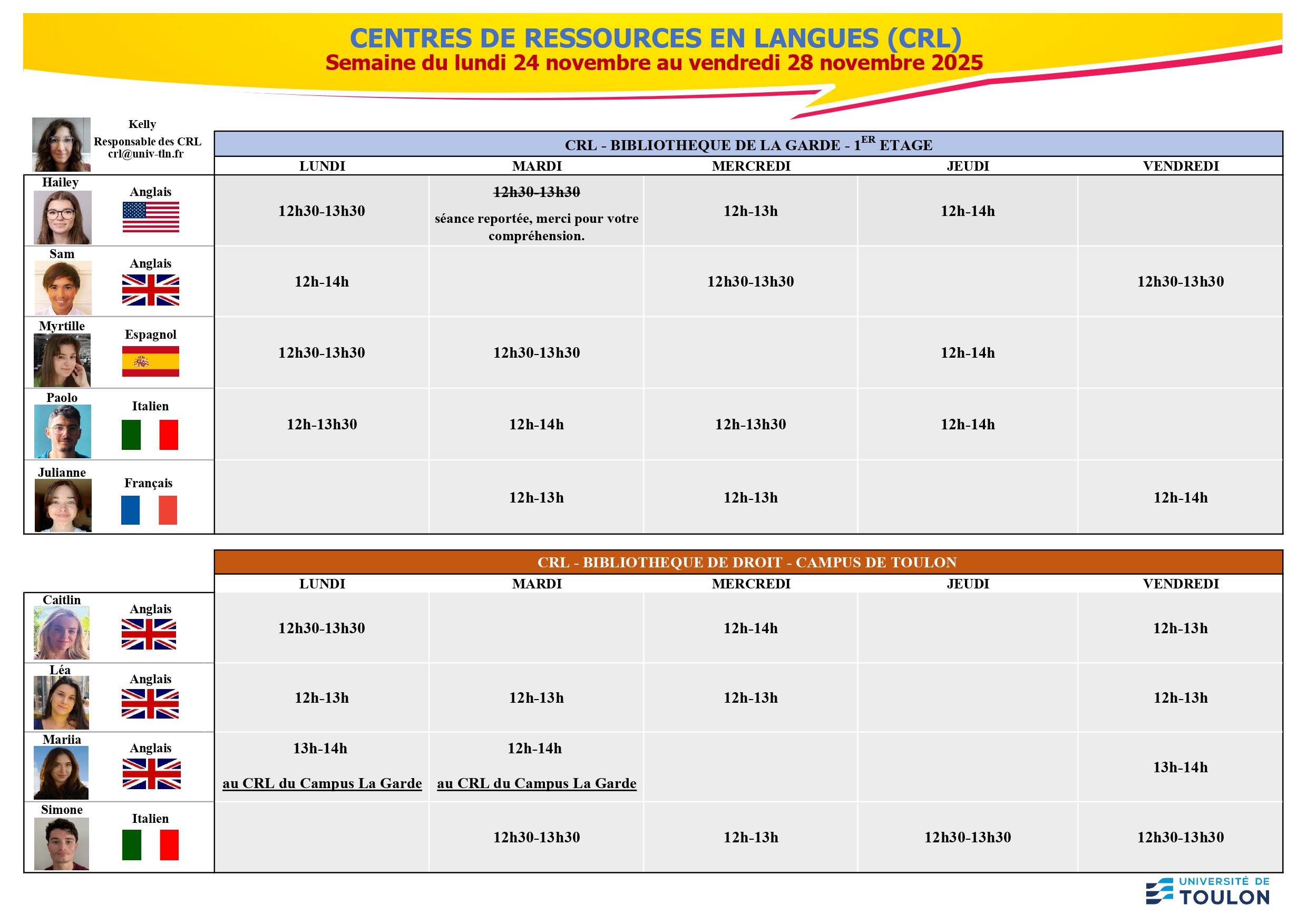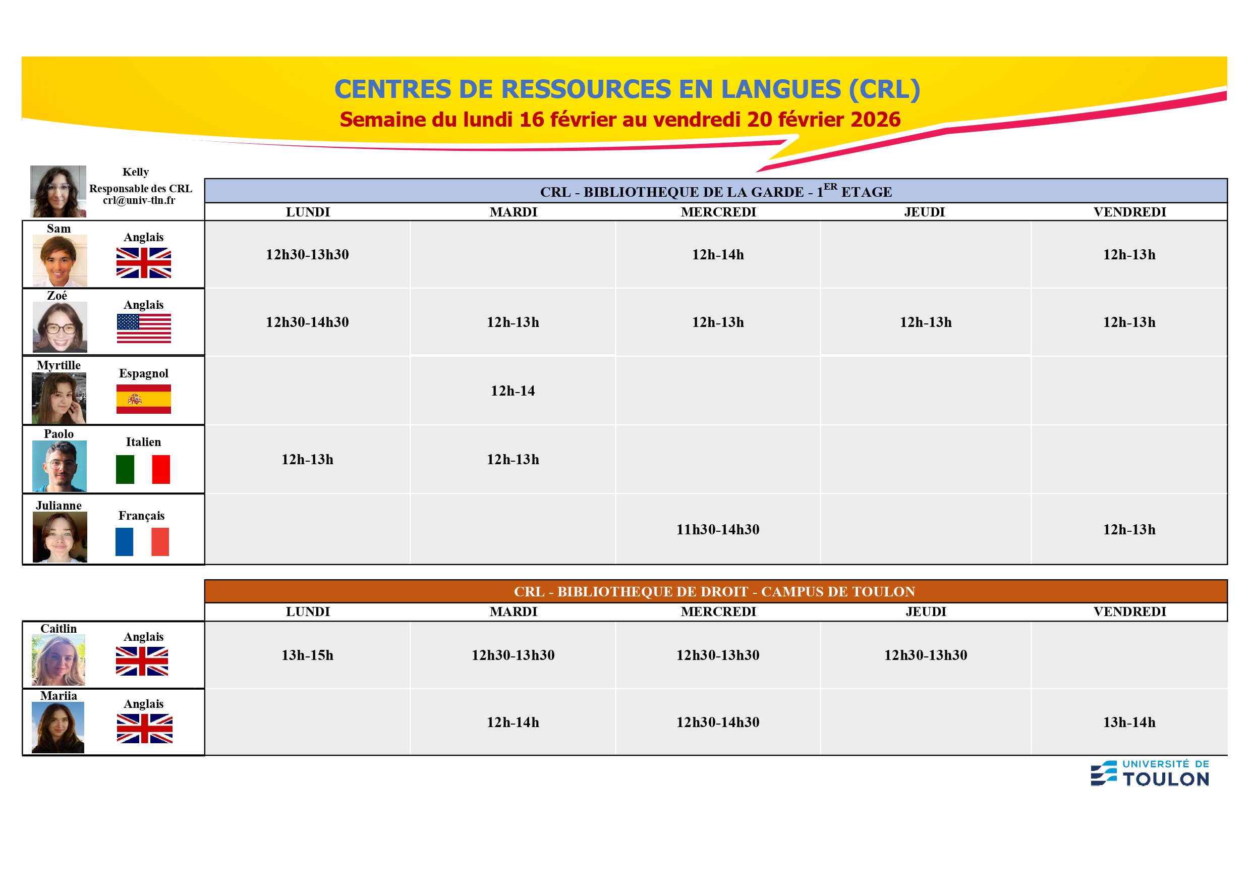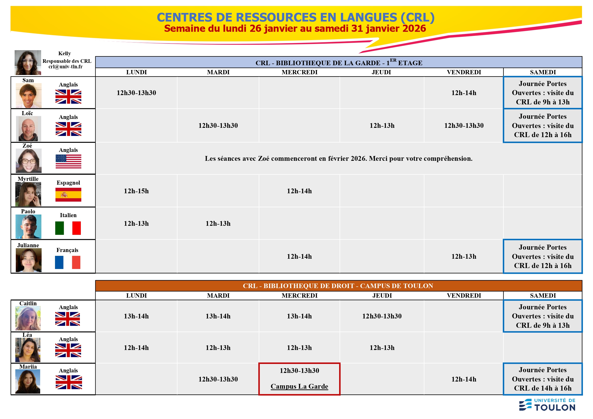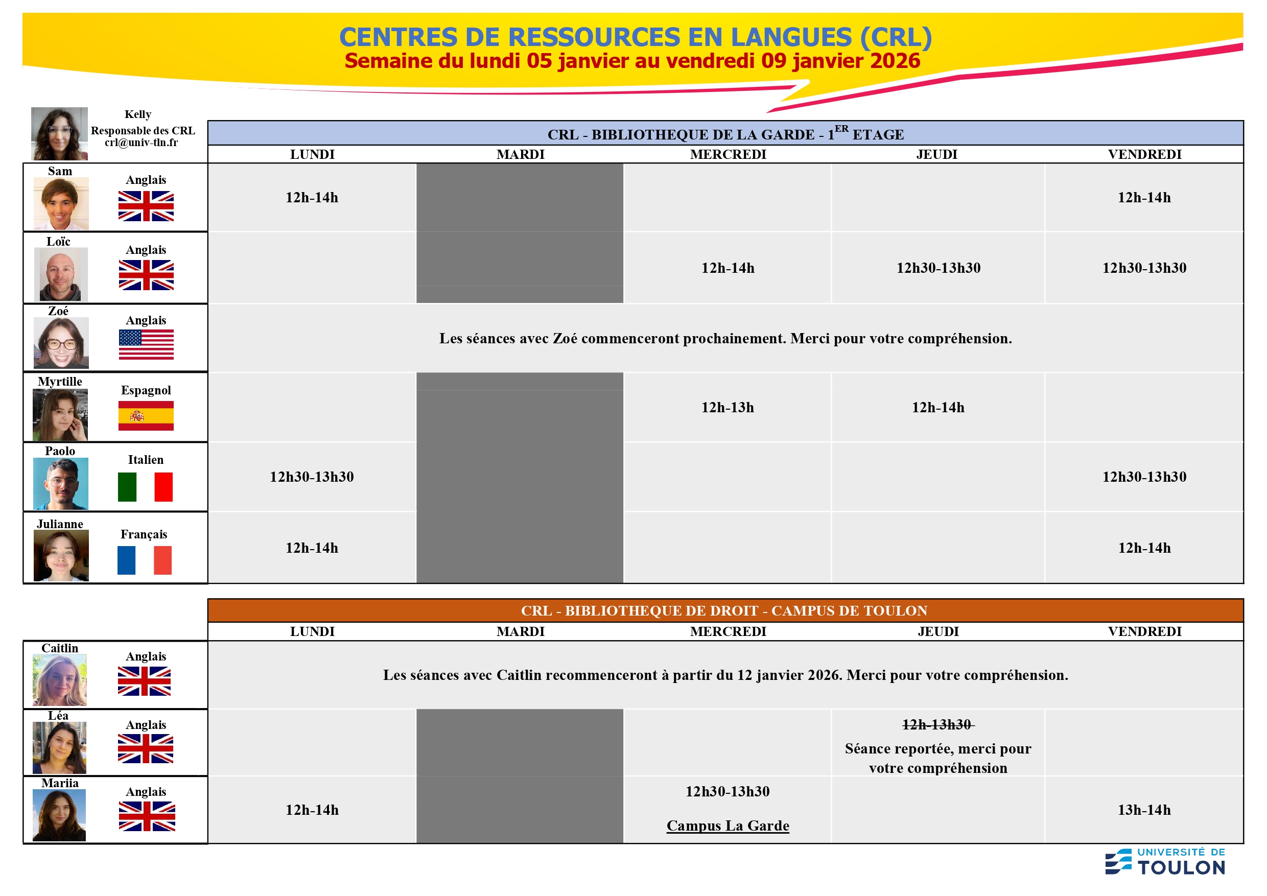 Le planning est mis à jour chaque semaine sur cette page ainsi que sur les portes d’entrée des CRL.