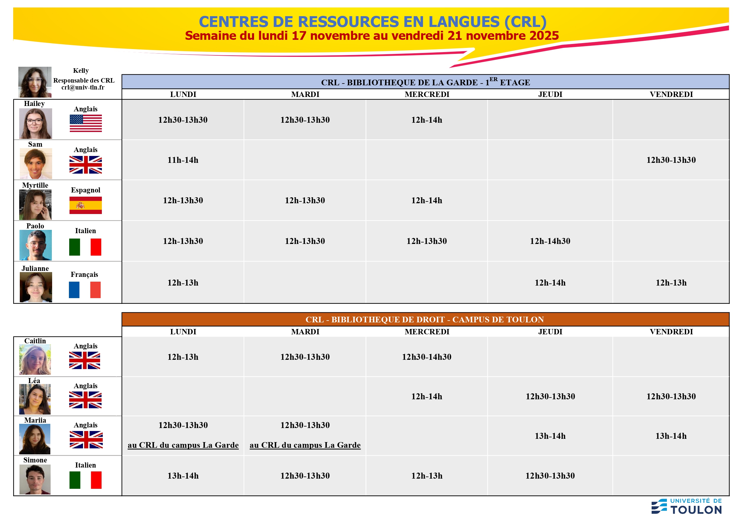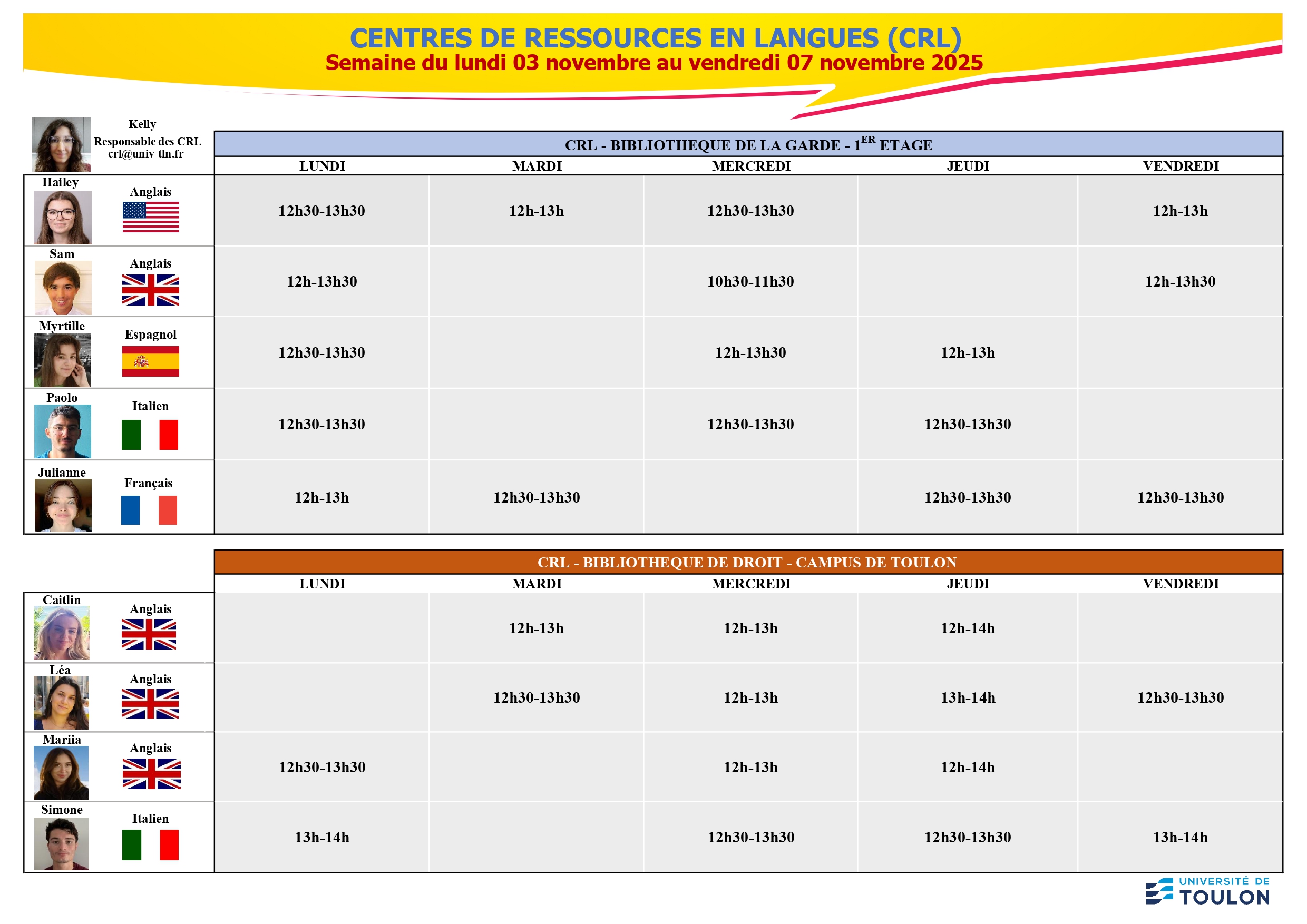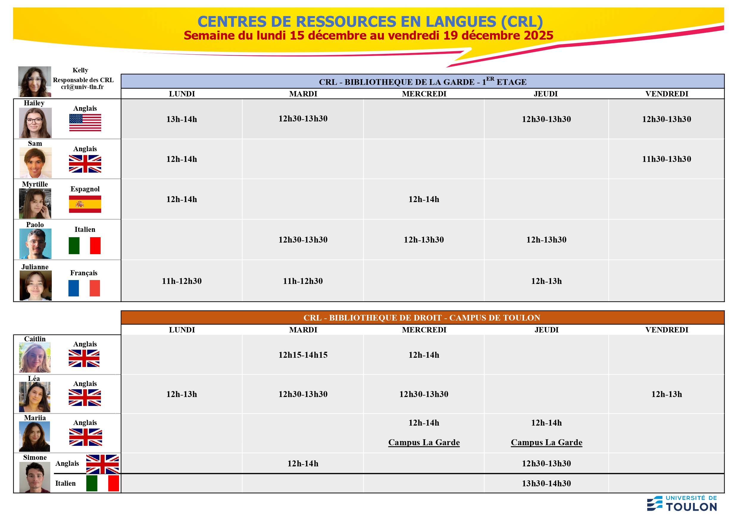 Le planning est mis à jour chaque semaine sur cette page ainsi que sur les portes d’entrée des CRL.