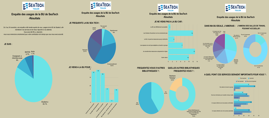 - Une majorité de répondants fréquentent uniquement la BU SeaTech, et dans le cas où ils fréquentent d’autres bibliothèques, il s’agit, pour la plupart, de bibliothèques du réseau