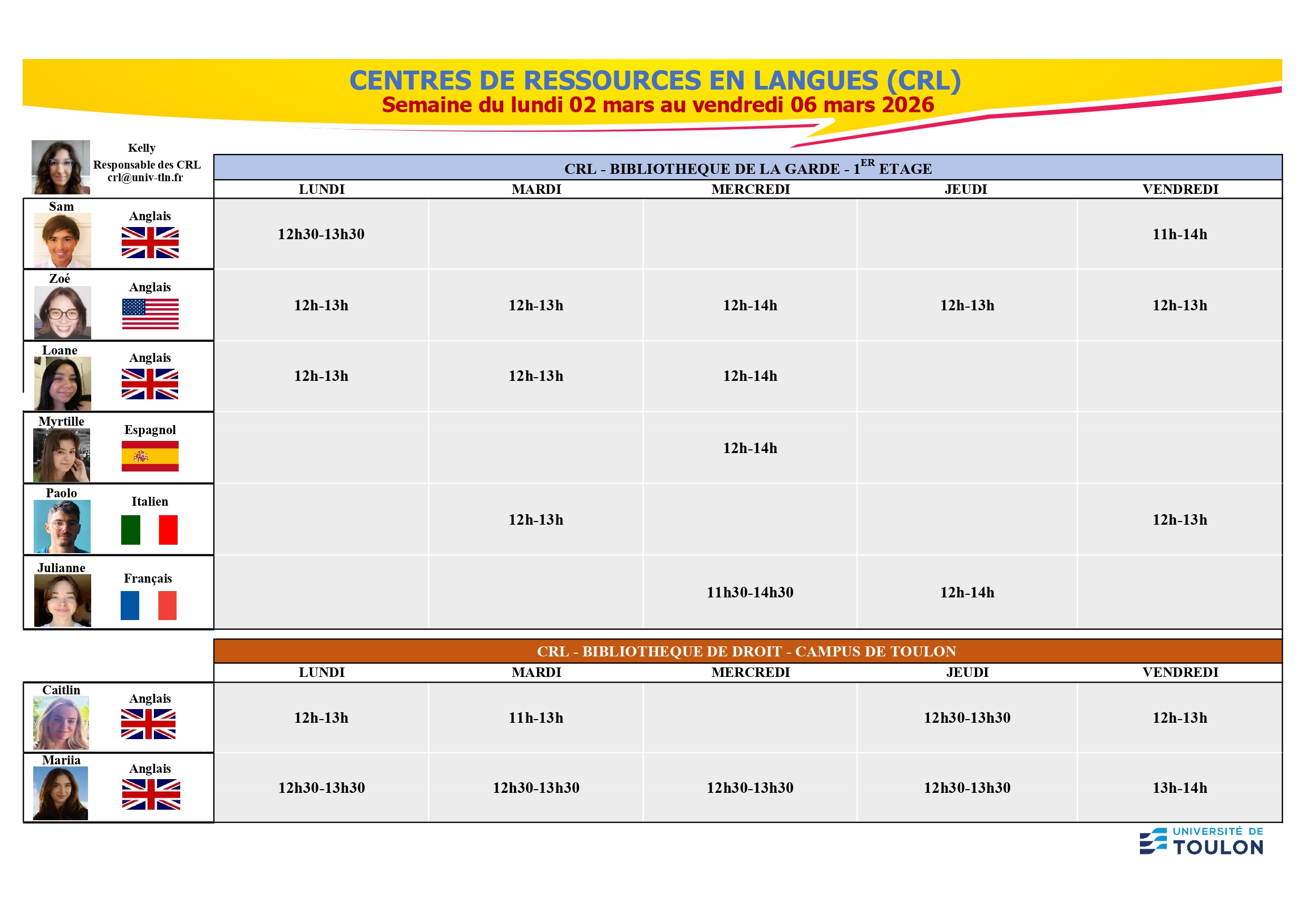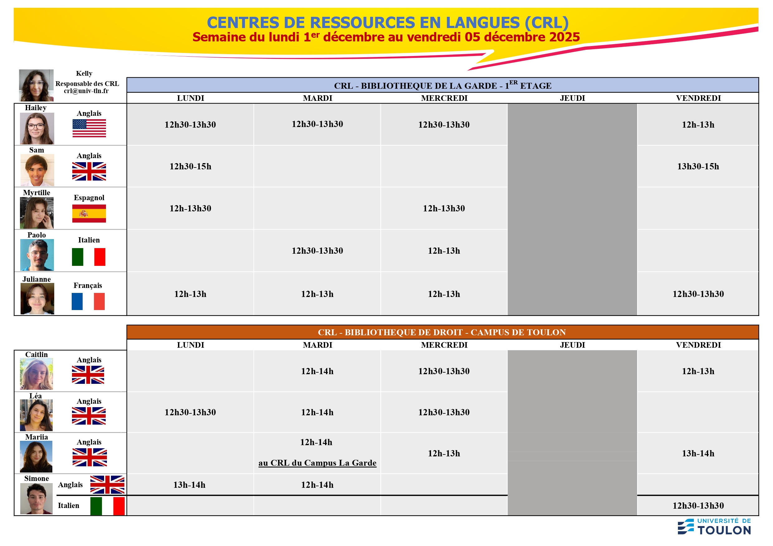 Le planning est mis à jour chaque semaine sur cette page ainsi que sur les portes d’entrée des CRL.